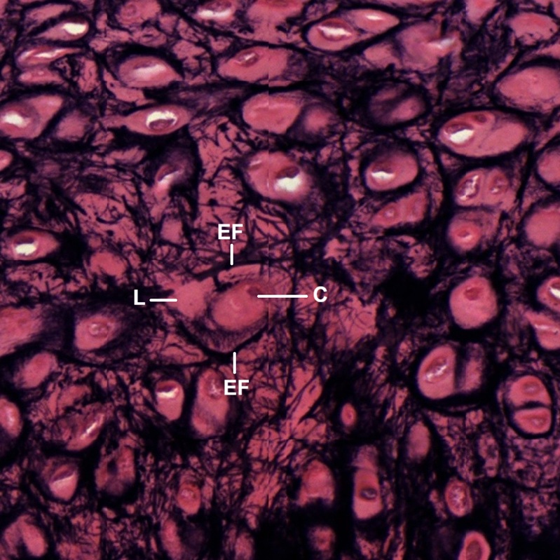 Instead of using hematoxylin-eosin stain which cannot reveal elastic fibers in the matrix clearly, Verhoeff’s Elastic stain is used (Fig.4-8). Dark colored elastic fibers are seen in the connective tissue (CT) beneath the epithelium and within the elastic cartilage (EC). Inside the cartilage (Fig. 4-9) elastic fibers (EF) are found to be condensed in the matrix between pale-colored lacunae (L) where chondrocytes (C) are located.