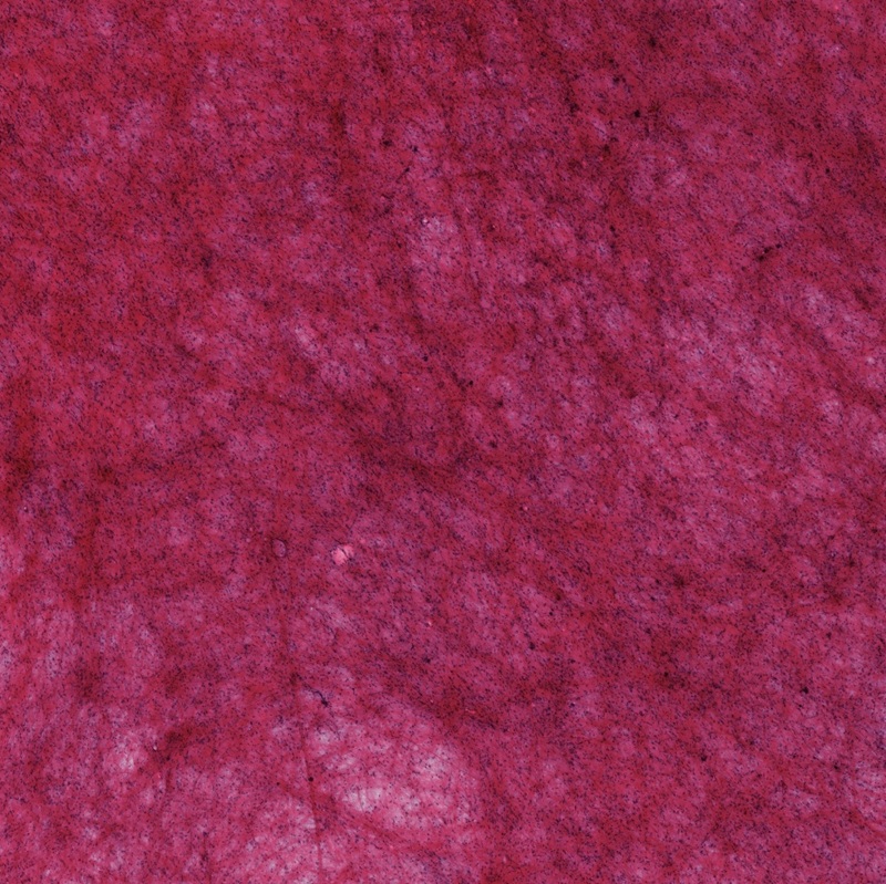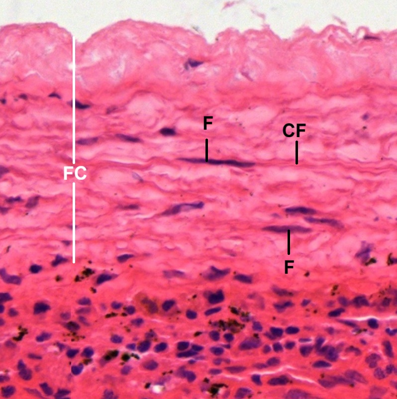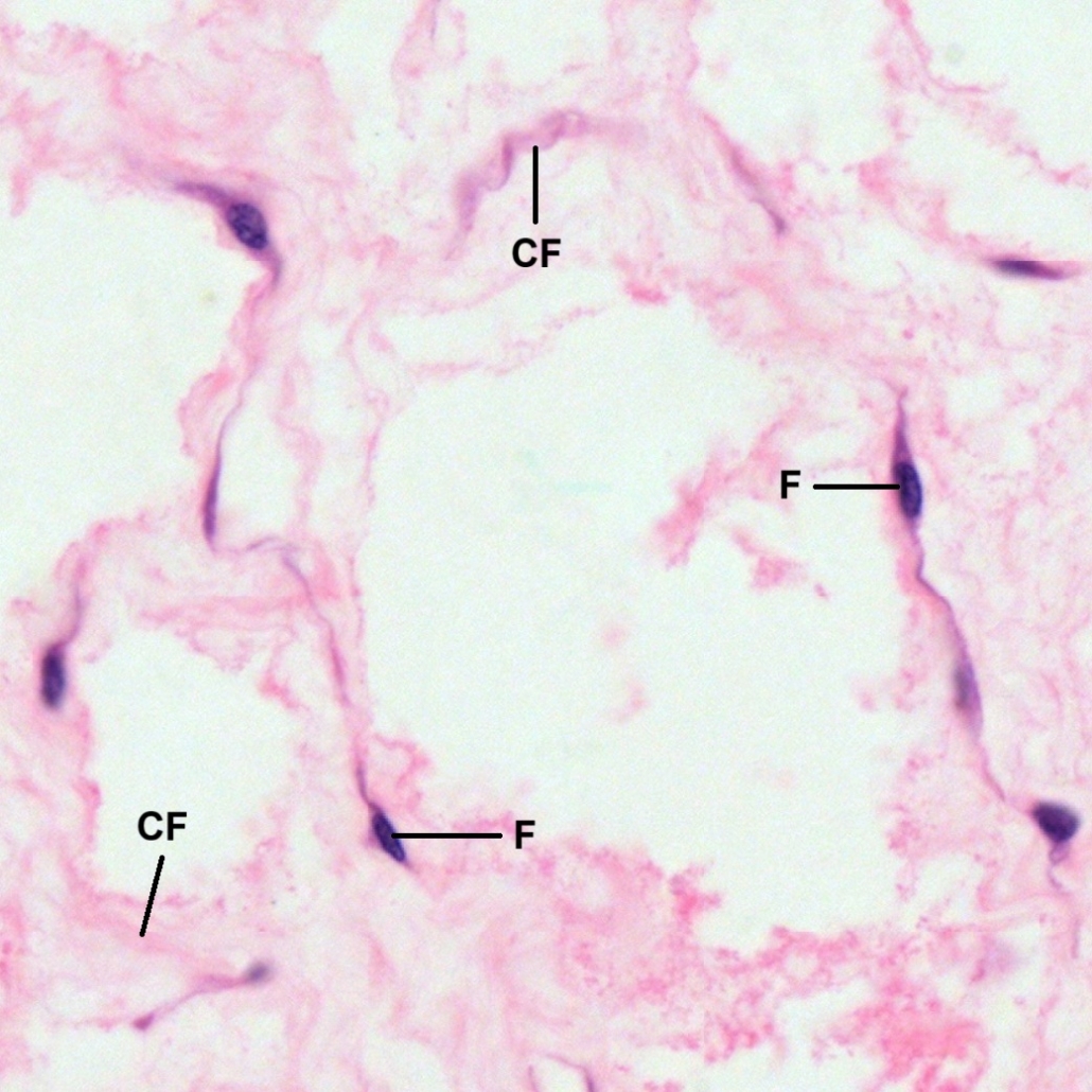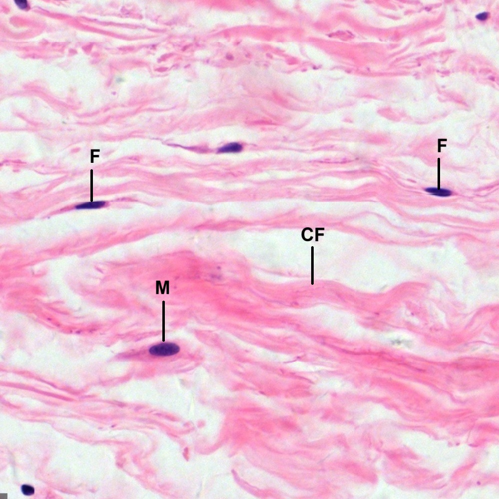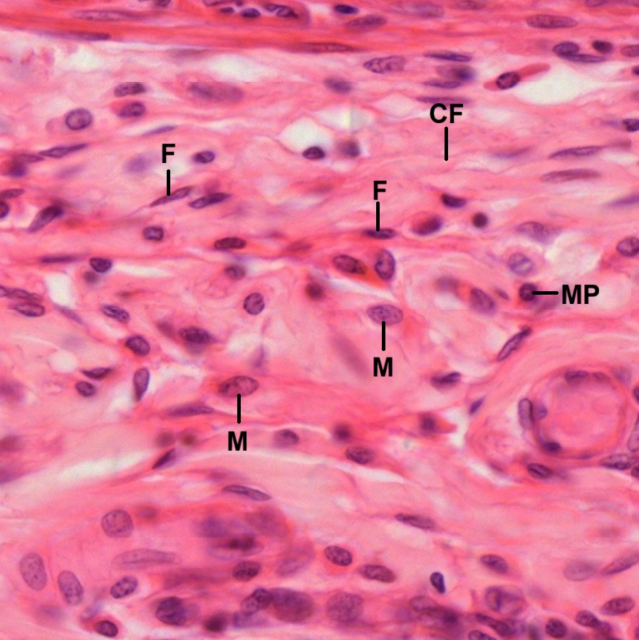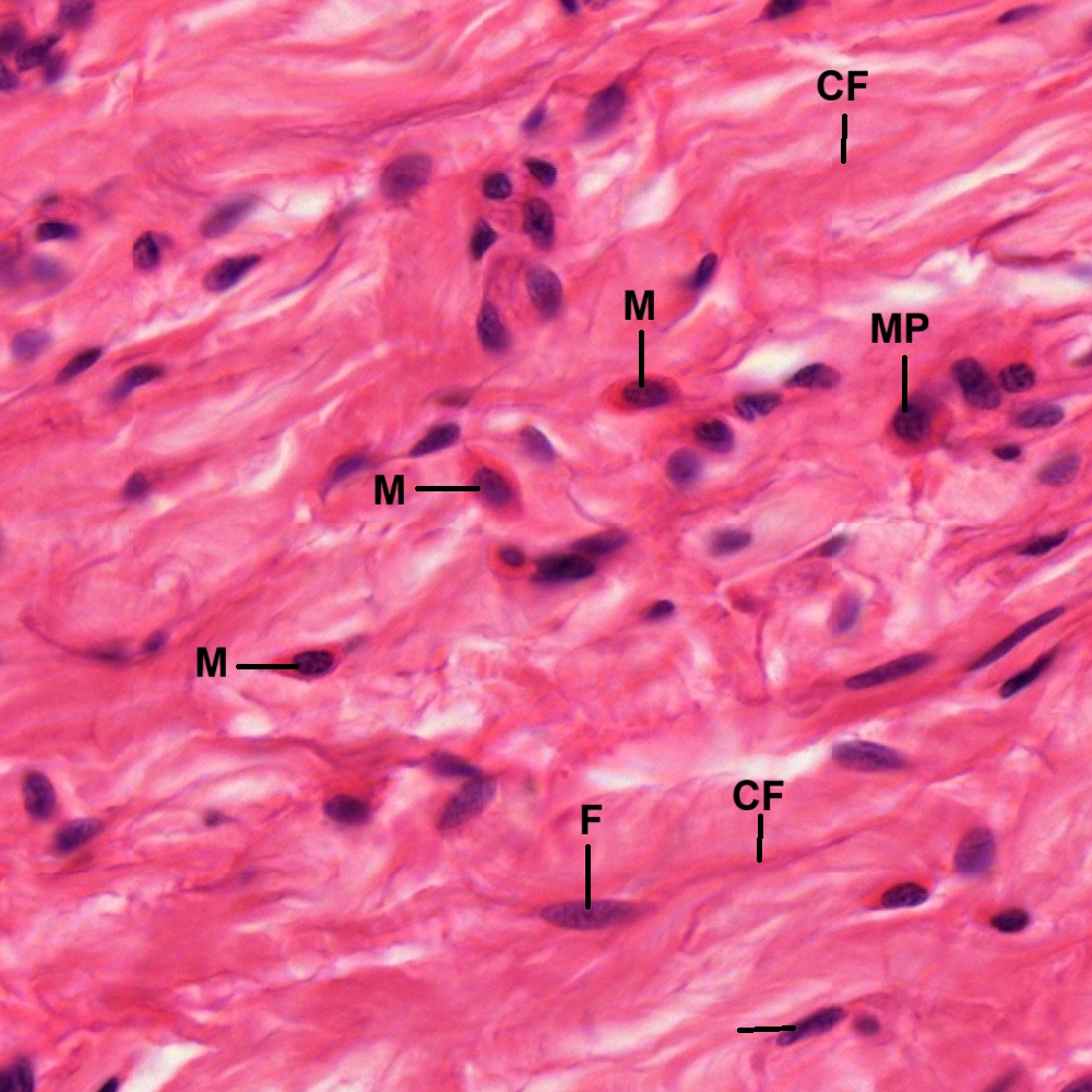 It is a type of dense connective tissue characterized by densely packed collagen fibers (CF) arranged in a haphazard, interwoven network, rather than parallel bundles. This structure provides high tensile strength and resistance to forces from multiple directions. It can be found in lower dermis of the skin (Fig. 3-19), the fibrous capsules (FC) of organs like spleen (Fig. 3-20), and the submucosa of the gastrointestinal tract such as jejunum (Fig. 3-21) and ileum (Fig. 3-22). The primary cells are widely spaced fibroblasts (F). Other observable cells include mast cells (M) and macrophages (MP).