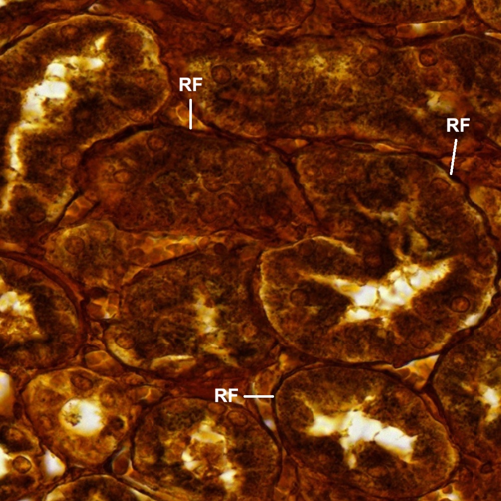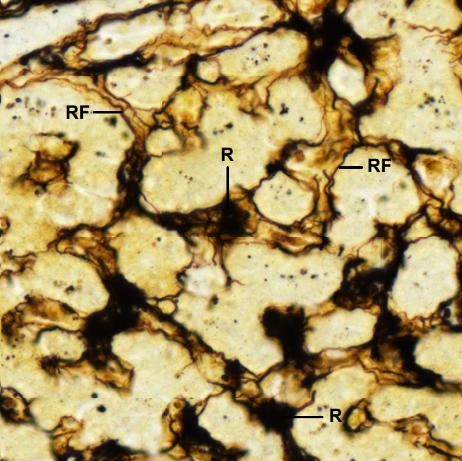Reticular tissue is a type of loose connective tissue composed of a delicate network of reticular fibers, providing a flexible, supportive framework (stroma) for highly cellular organs like lymph nodes, liver, kidney, spleen, and bone marrow. These fibers are produced by specialized fibroblasts known as reticular cells. The mesh-like structure of reticular tissue creates a supportive microenvironment for cells to filter fluids and maintain organ architecture. In sections of lymph node (Fig. 3-8), liver (Fig. 3-9), and kidney (Fig. 3-10) stained by silver impregnation, dark stained reticular cells (R) and reticular fibers (RF) can be seen.