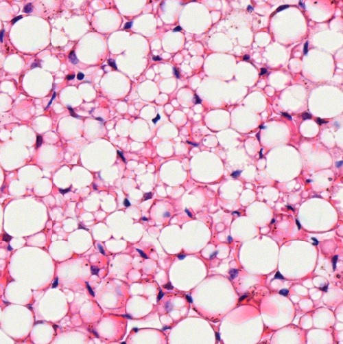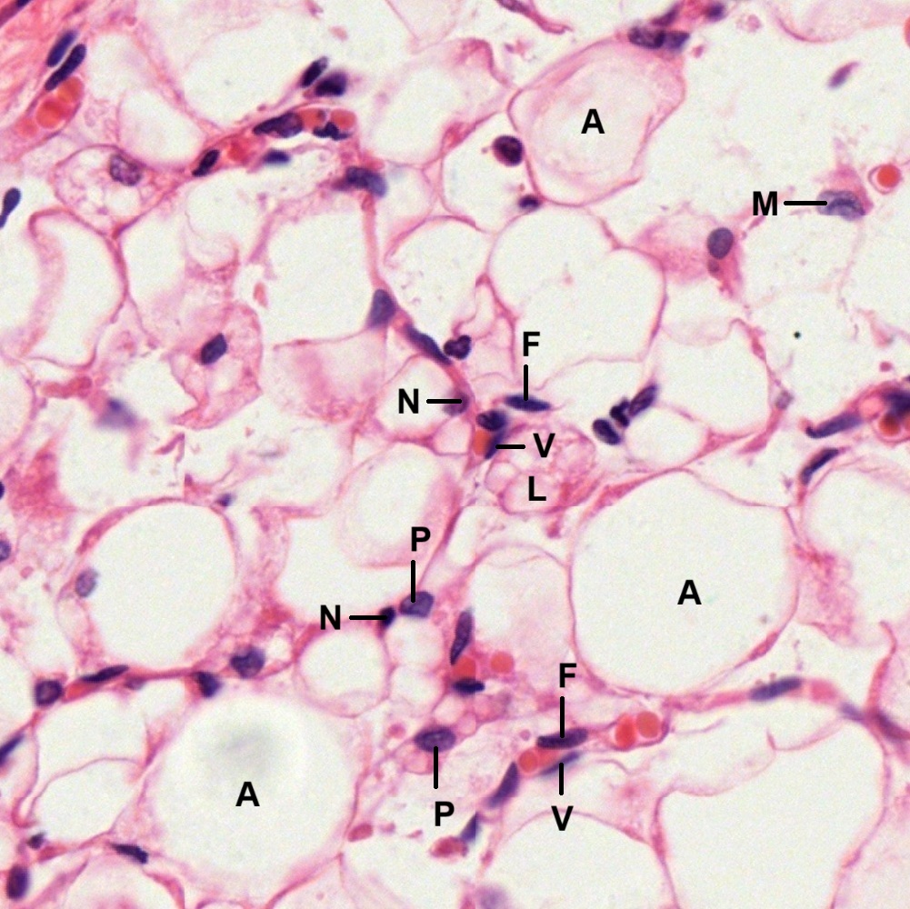 Adipose tissue is a loose connective tissue, also known as fat tissue. There are two kinds of adipose tissues. Visually they are distinguished by colors, white or brown.