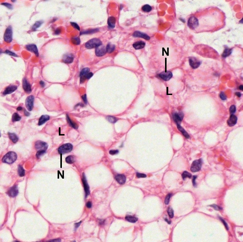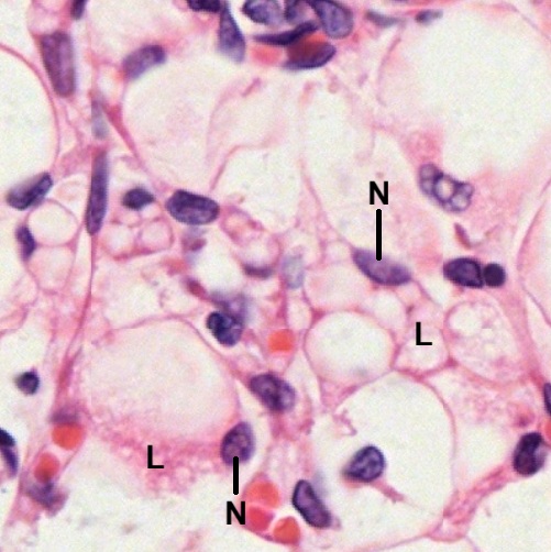 It comprises 20-25% of total body weight in normal adults and mainly in deep layers of skin. In a section of adipose tissue stained by hematoxylin and eosin (Fig. 3-11), many adipocytes (A) are found to form a spiderweb-like organization due to unstained lipid component removed from cytoplasm during preparation (Fig. 3-12). Adipocyte nuclei (N) are squeezed to outer rim of the cytoplasm by these empty vacuoles. Other cells, like preadipocytes (P), Fibroblasts (F), vascular endothelial cells (V) and a variety of immune cells such as adipose tissue macrophages (M), can also be found. The main role of adipose tissue is to store energy in the form of lipids, although it also cushions and insulates the body. In most cases, lipid content of adipocytes is found to fuse into a single large droplet. In certain area of the adipose tissue (Figs. 3-13 and 3-14) it is found that few adipocytes contain small vacuoles of lipid droplets (L). Nuclei (N) of these adipocytes or preadipocytes are not squeezed to outer rim of the cytoplasm by these small vacuoles.