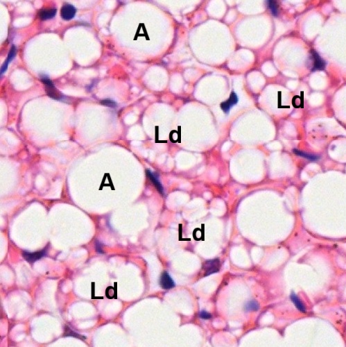 It is mainly found in newborn mammals and some hibernating animals and contains a rich supply of mitochondria, which gives it a reddish-brown color. Only small amounts of brown adipose tissue are found in human adults. In a section of brown adipose tissue taken from mouse, stained by HE (Fig. 3-15), it is found that there are more adipocytes containing many small vacuoles than those containing single large vacuoles (Fig. 3-16). At higher magnification (Figs. 3-17 and 3-18), among single vacuoles-containing adipocytes (A) more adipocytes are found to contain small vacuoles inside the cytoplasm. These small vacuoles are lipid droplets (Ld).