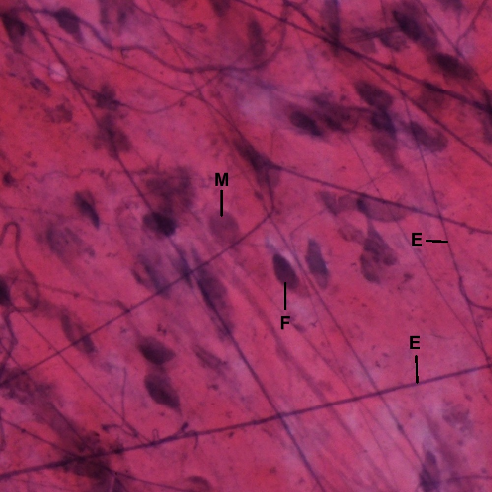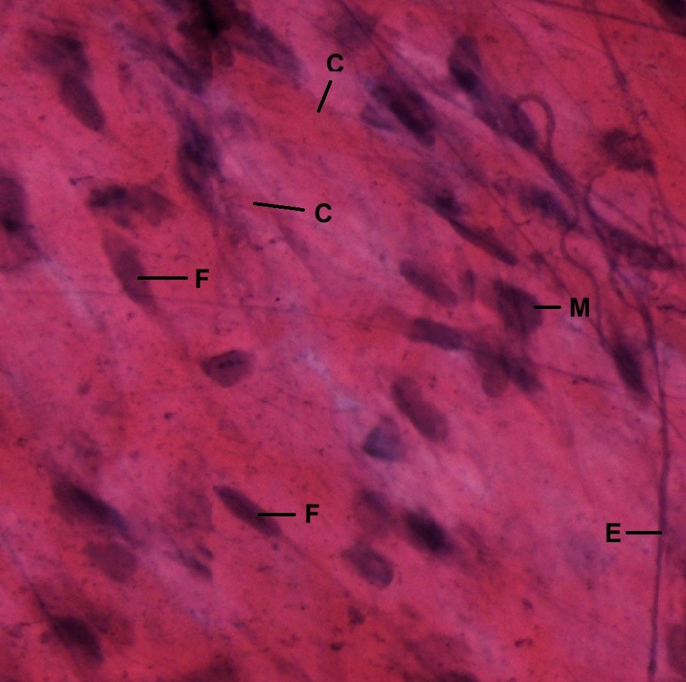It is also known as areolar tissue which constitutes much of superficial fascia and surrounds different organs in the human body. By mounting a flattened piece of stained areolar tissue, such as mesentery (Fig. 3-1), on slide, it can be seen to be composed of fibers and cellular elements within the ground substance primarily made up of collagenous and elastic fibers (Fig. 3-2). Collagenous fibers (C) are pale stained wide bands in contrast to dark stained slender-shaped elastic fibers (E). Spindle-shaped cells with tails are seen to be widely dispersed in the tissue (Figs. 3-2 and 3-3). They are fibroblasts (F). The other cells being identified in this preparation are large oval-shaped mast cells (M). Mast cells can be highlighted in a mounting preparation stained by methylene blue (Fig. 3-4). Abundant granules are seen within the cytoplasm.