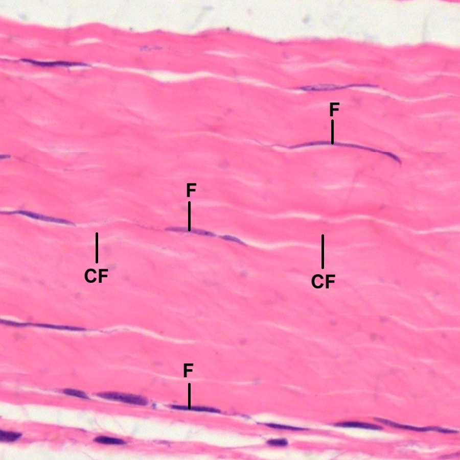 In contrast to the dense irregular connective tissue, it is a strong fibrous tissue made of densely packed, parallel collagen fibers arranged by fibroblasts. This parallel structure provides high tensile strength and allows the tissue to transfer force in a single direction. Common examples of dense regular connective tissue include tendons (Fig. 3-23) and ligaments (Fig. 3-25). In longitudinal sections of both tissues, densely packed, parallel collagen fibers (CF) arranged by fibroblasts (F) can be seen clearly. In cross section of tendon (Fig. 24), these parallel collagen fibers are observed to be red dots with blue dots of fibroblasts scattered among them. Despite of histological similarity, they play different roles in anatomy. Tendons connect muscle to bone while ligaments connect bone to bone. There is another type of dense regular connective tissue called elastic ligament or yellow elastic ligament (Fig. 3-26). The term includes “elastic” due to its component of elastic fibers which cannot be distinguished from collagen fibers after hematoxylin-eosin staining. The presence of elastic fibers makes elastic ligament to be yellow. It is mainly found to be ligament between vertebrae, called ligamentum flavum (= yellow ligament in English). In term of color, tendon and ligament are collectively known as white fibrous tissue. In contrast, elastic ligament is known as yellow fibrous tissue.