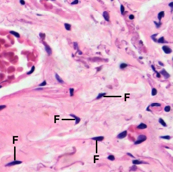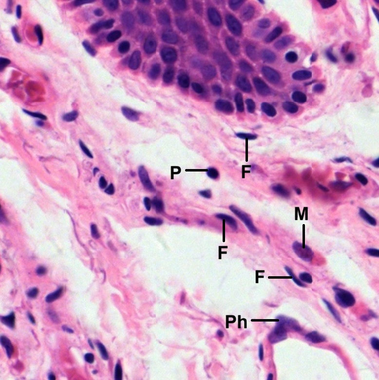 In a tissue or organ section, such as skin section is used as an example, areolar tissue is found underneath the epithelial layer or epidermis, also known as papillary dermis (Figs. 3-5 and 3-6), which is the thin, upper layer of dermis. It features finger-like projections called dermal papillae, which interlock with the epidermis to create a strong connection and increase surface area. This layer contains loose connective tissue, blood vessels that nourish the skin, nerve endings for touch sensation. The predominant cells are fibroblasts (F). Other cells like mast cells (M), plasma cells (P), and phagocytes (Ph) can also be found. (Fig. 3-7).