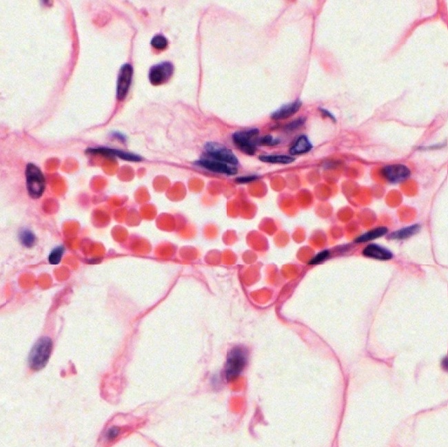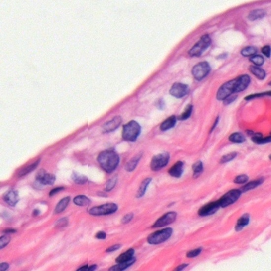 Simple squamous epithelium is a single layer of flattened, scale-like cells that lines surface where rapid diffusion or filtration is needed. It’s found in places like the lining of blood vessels, the body cavities, and the air sacs of the lungs. They have different names in each place, endothelium lining the blood vessels (Figs. 2-1 and 2-2), mesothelium paving the body cavities (Fig. 2-3), and alveoli covering the air sacs of the lungs (Fig. 2-4)