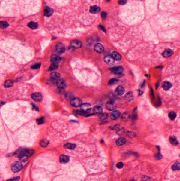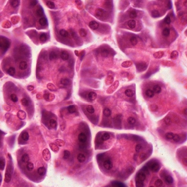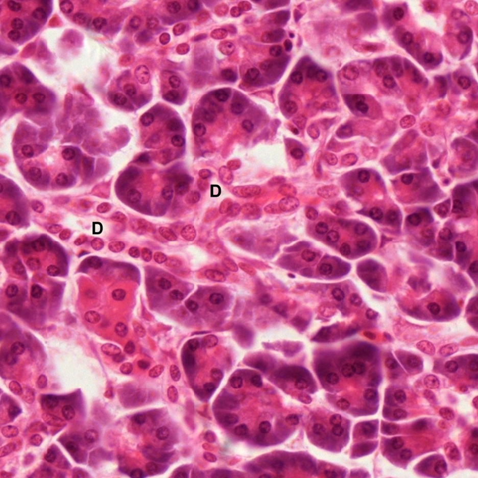 The typical compound acinar glands are found in pancreas (Fig. 2-59). It is composed of many secretory acini with branched duct (D).