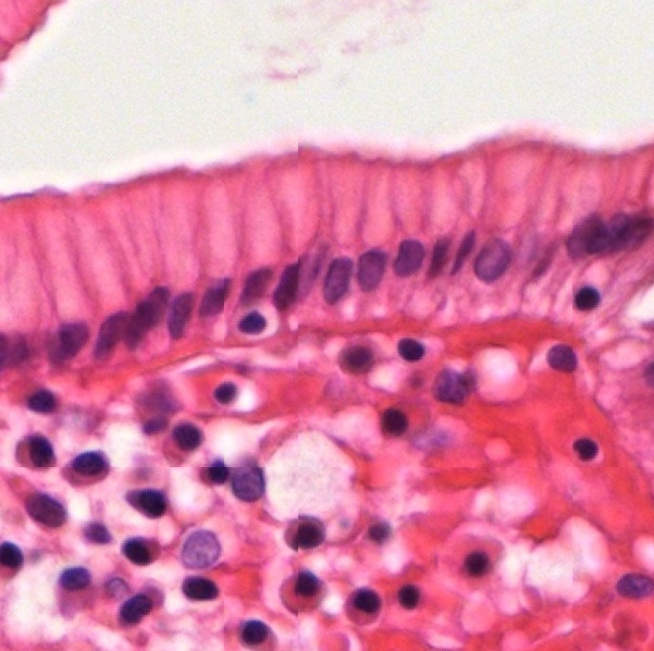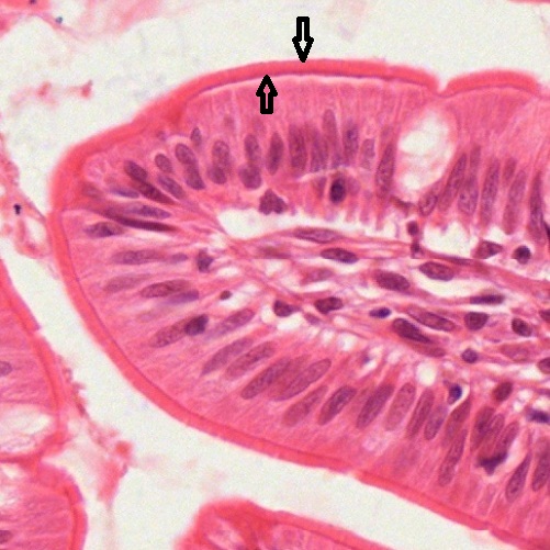 It is similar to simple cuboidal epithelium except that cells are taller and columnar in shape at right angles to the basement membrane. The typical example is the epithelium lining the entire intestinal villi (Fig. 2-16). Each intestinal epithelial cell has numerous, tiny, finger-like projections called microvilli (arrow), which are arranged in such a way to form the appearance of a striated border or brush border (arrow) observable under the light microscope. In addition to the intestines, similar columnar epithelial cells with microvilli are also found to line the mucosa of stomach (Fig. 2-17), gallbladder (Fig. 2-18), and uterus (Fig. 2-19).