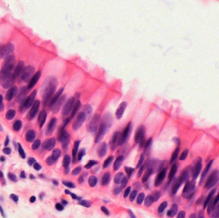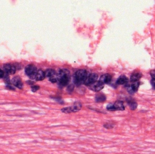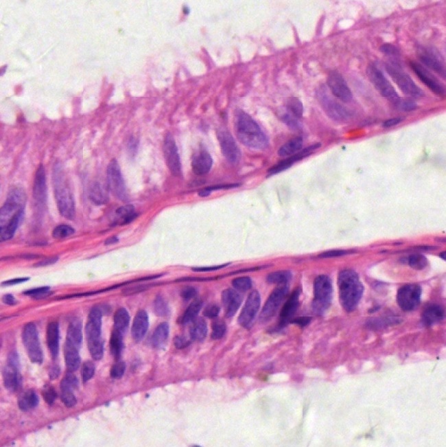 It is a variant of the simple columnar epithelium due to the appearance of this epithelium in section which conveys the erroneous impression that there is more than one layer of cells. Actually, this is a true simple epithelium due to the fact that all epithelial cells rest on the basement membrane. It is mainly found in the nasal passage of the upper respiratory tract, like trachea (Fig. 2-25) and bronchi (Fig. 2-24) of the lower respiratory tract. Cilia are characteristic features of this respiratory epithelium, then it is called pseudostratified columnar ciliated epithelium. In other organs such as prostate (Fig. 2-26) and epididymis (Fig. 2-27) non-ciliated pseudostratified columnar epithelium can also be found. The cellular projections from cell surface are not cilia but stereocilia.