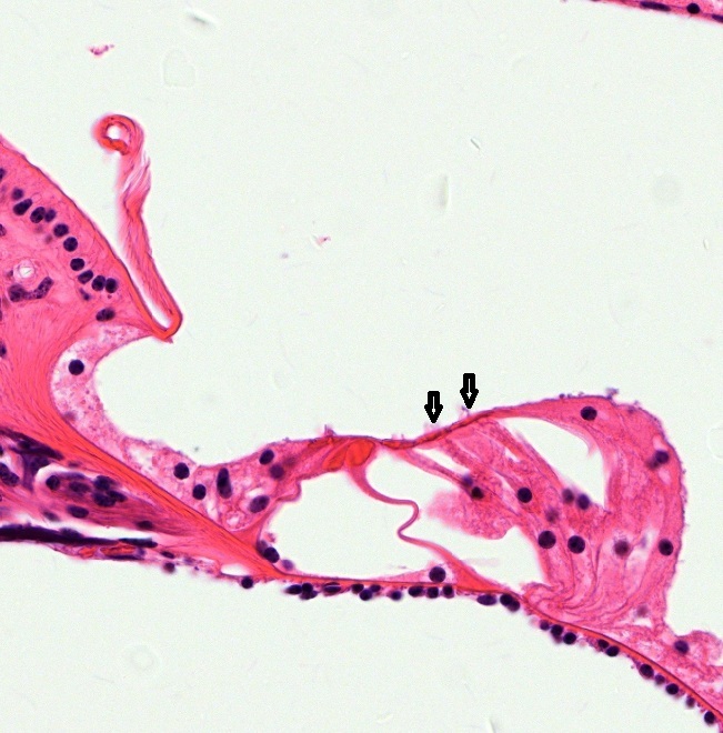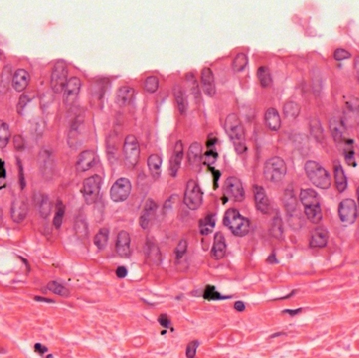 Transitional epithelium, also known as urothelium, is a type of stratified epithelium found in the urinary organs, from renal pelvis (Fig. 2-44), ureter (Fig. 2-45), to urinary bladder (Figs. 2-46 and 2-47). It’s unique because it can change shape, flattening out when stretched and returning to a more cuboidal shape when relaxed, allowing the bladder to expand and contract as needed. In the relaxed (contracted) state (Fig. 2-46), transitional epithelium has 4-5 cell layers containing cuboidal basal cells, polygonal intermediate cells, and large round surface cells. In the stretched state (Fig. 2-47), transitional epithelium appears to have 2-3 cells layers with extremely flattened intermediate and surface cells.