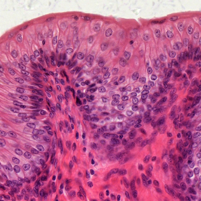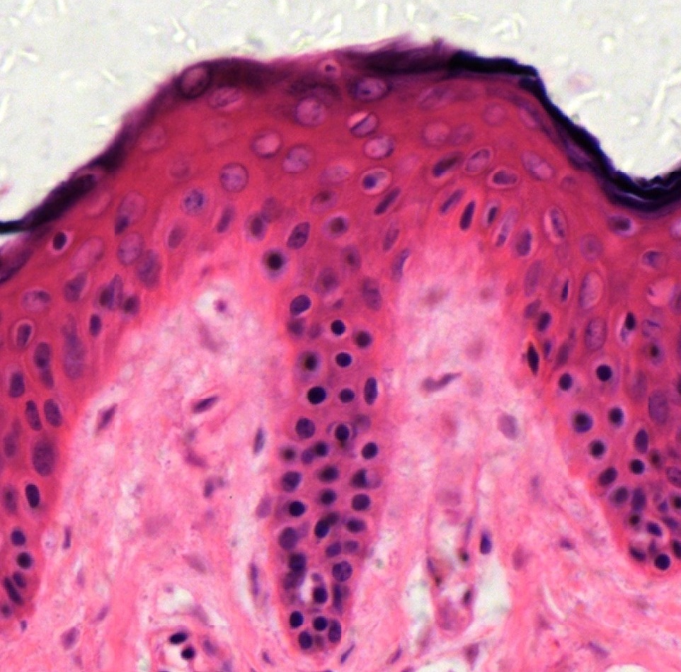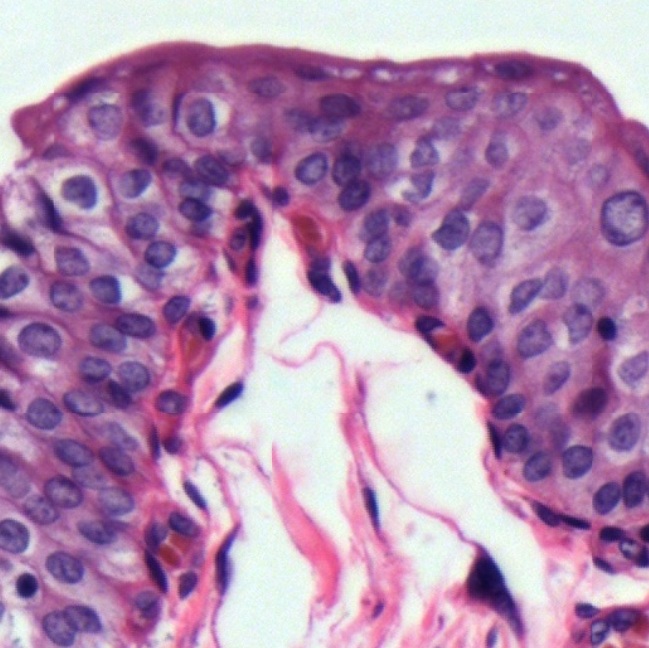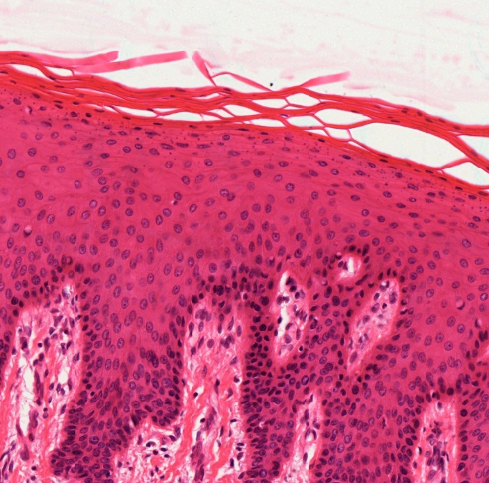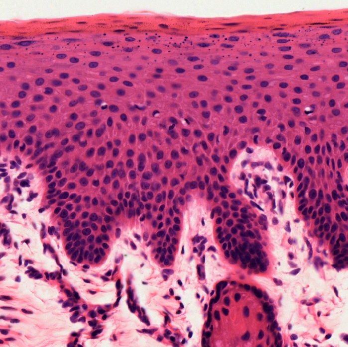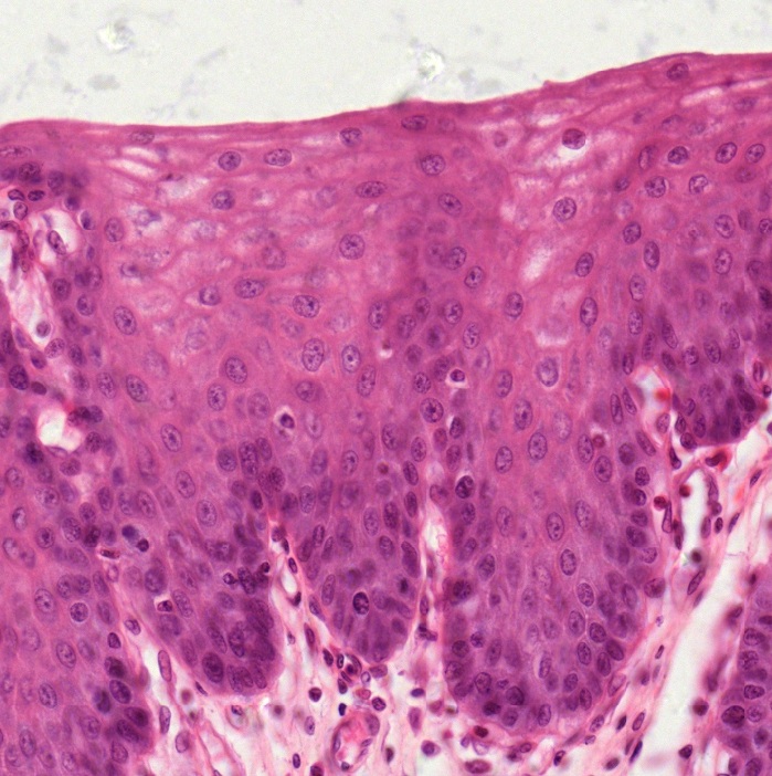 Stratified squamous epithelium consists of variable cell layers showing transition from cuboidal basal layer to flattened surface layer. It’s found in areas of the body being worn and tore, like the skin (Fig. 2-28), mouth (Fig. 2-29),esophagus (Fig. 2-30), and anal canal where the surface epithelium is transformed from simple columnar to stratified squamous (Fig. 2-31). The multiple layers of cells act as a barrier, providing a robust defense against abrasion and damage.
