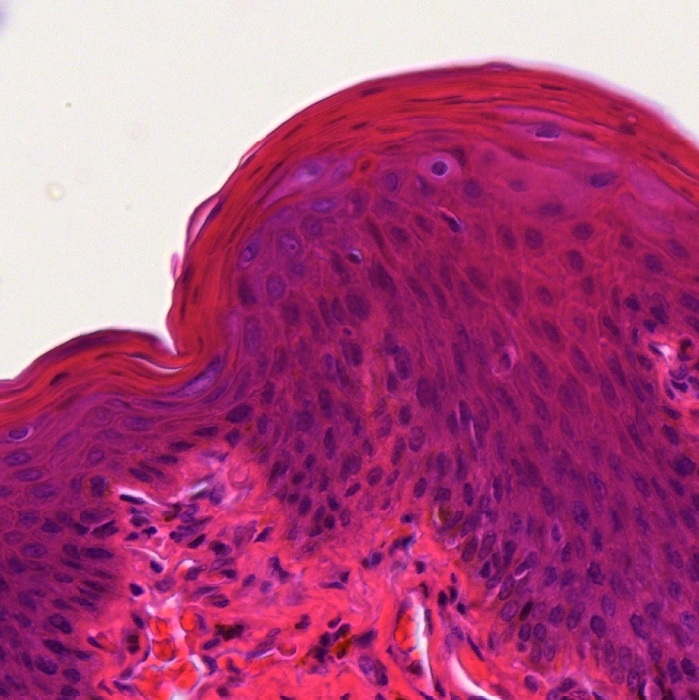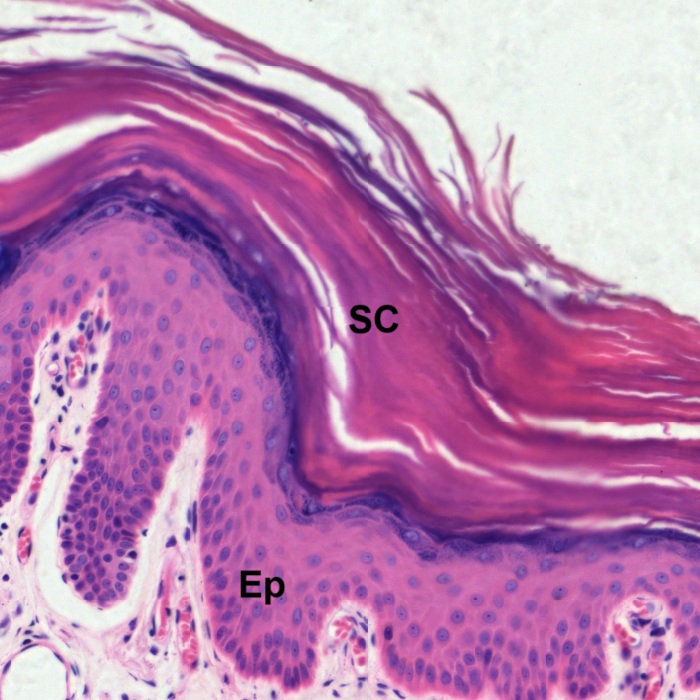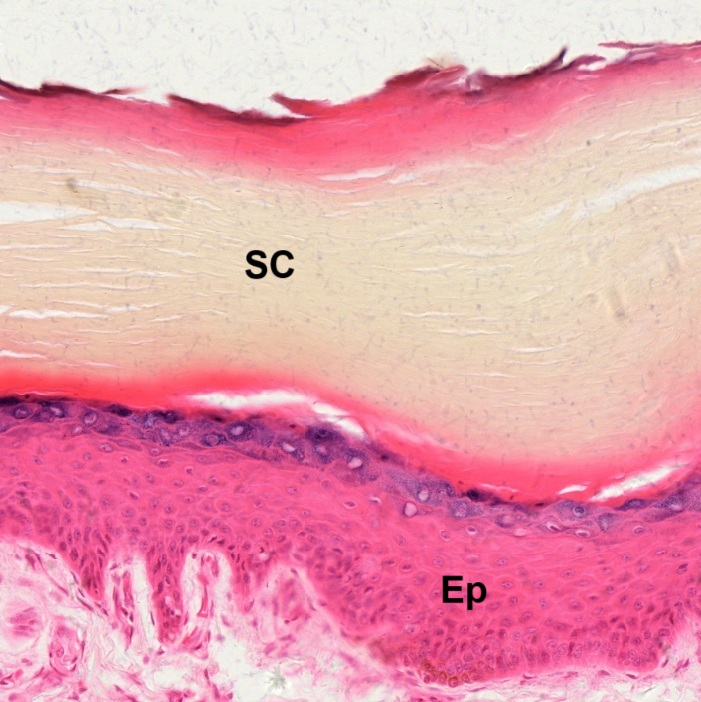 In skin, the surface layer of epithelial cells is adapted to bear to withstand constant abrasion and desiccation. The surface epithelial cells accumulate keratin granules through a process called keratinization, resulting in the formation of non-living, cornified layer called stratum corneum (SC) on the top of epidermis (Ep). Then this epithelium is keratinized squamous epithelium (Figs. 2-32 and 2-33). In the oral cavity, hard plate (Fig. 2-34) and soft plate (Fig. 2-35) usually are covered by non-keratinized squamous epithelium. Occasionally, keratinized squamous epithelium can be observed on the hard plate due to being exposed to excessive abrasion or desiccation.