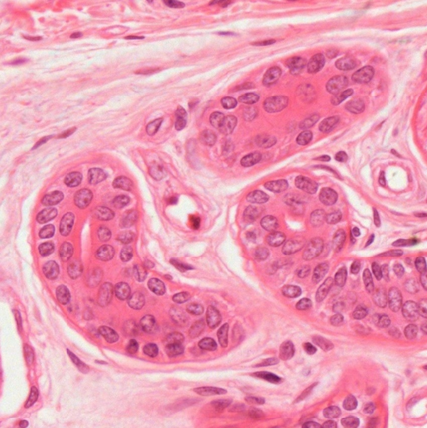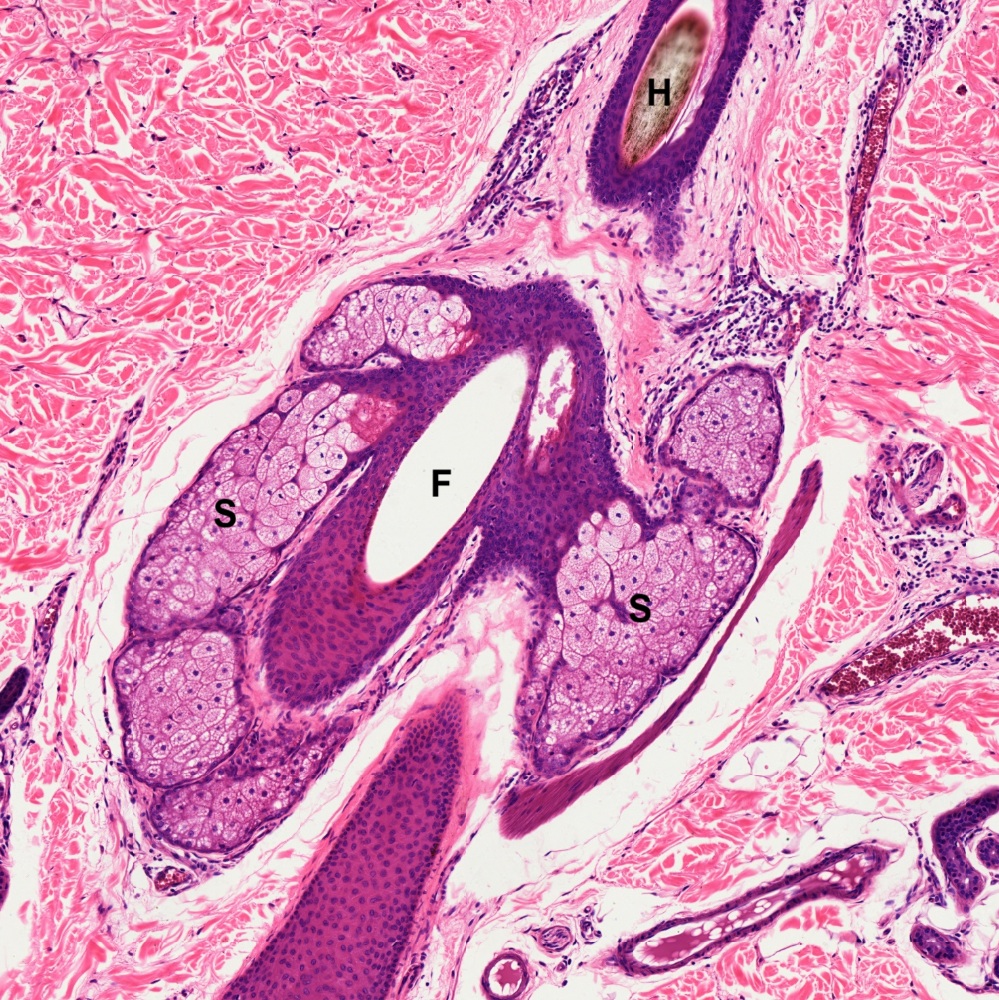 H020100 Glandular Epithelium, sec. of scalp showing sebaceous gland, human, HE.