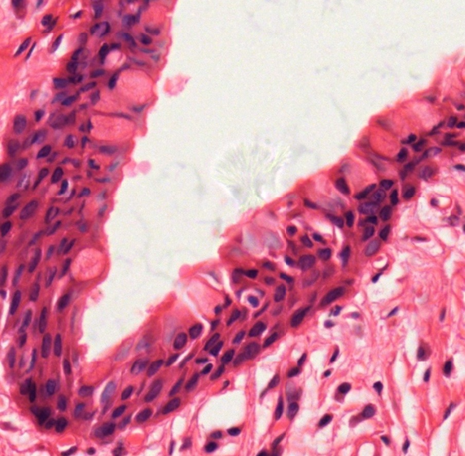 H020050 Stratified Columnar Epithelium, cs. of parotid duct, human, HE. (Fig. 2-43)