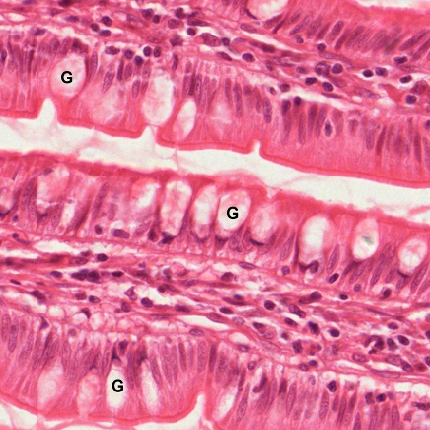 Among exocrine glands, goblet cells (G) are the only unicellular exocrine glands. Many goblet cells can be found interspersed within simple columnar (Fig. 2-48) and pseudostratified columnar (Fig. 2-49) epithelia. Other exocrine glands can be broadly divided into simple and compound glands.