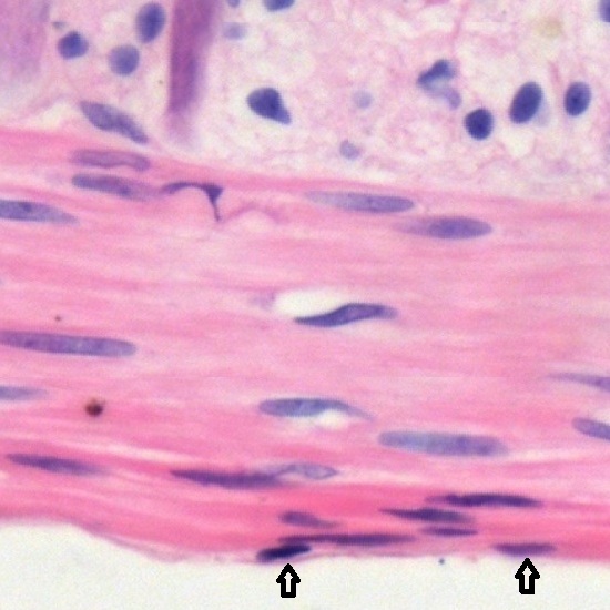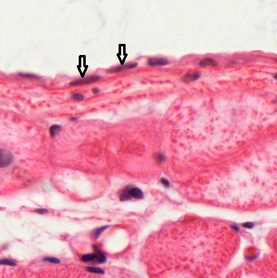 Simple squamous epithelium is also involved in formation of endocardium of heart (Fig. 2-5), Bowman’s capsule of kidney (Fig. 2-6), and adventitial lining of gastrointestinal tract (Figs. 2-7).