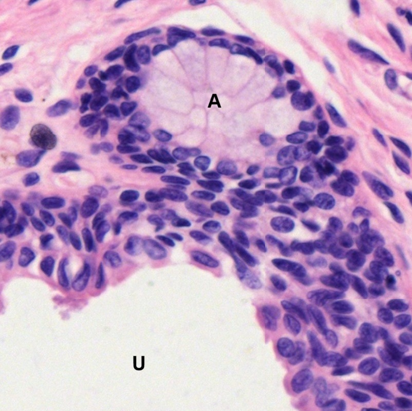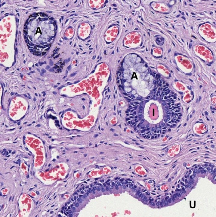They can be found in the epithelial lining of male urethra (Fig. 2-54). They form pockets (A), i.e., acini (pleural form of acinus) lining with secretory cells, which are pale stained compared to non-secretory cells lining the male urethra (U). Acini are not only formed from epithelial wall of male urethra, but also from the invagination (I) of urethral epithelium (Fig 2-55).