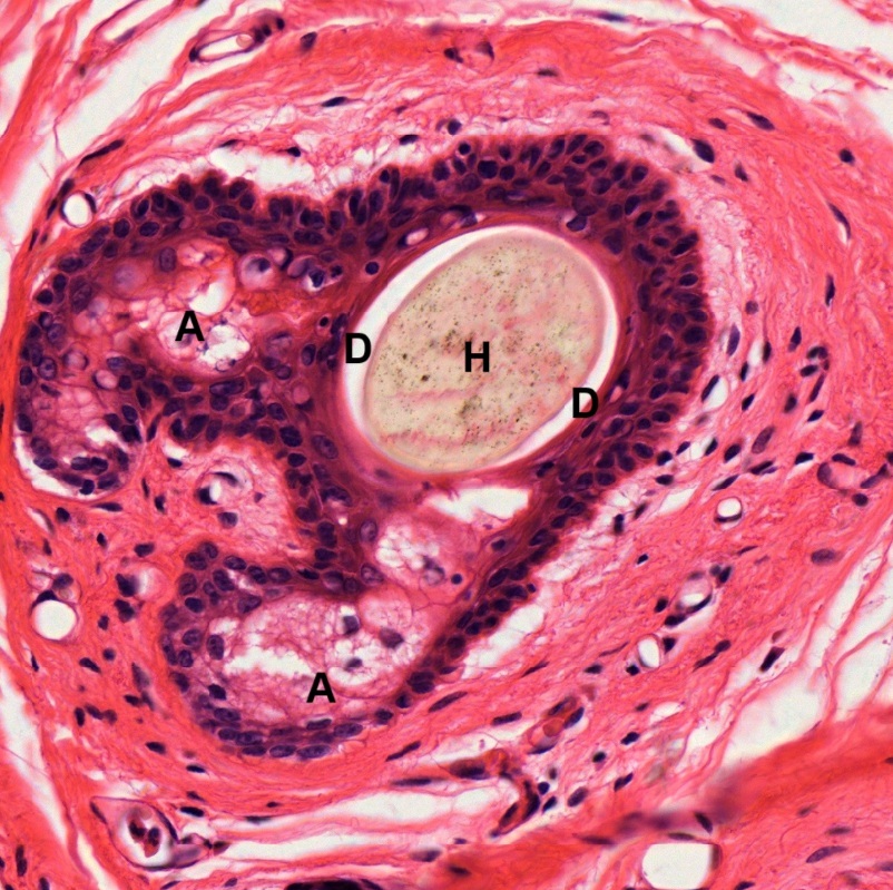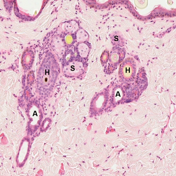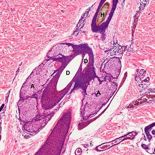 The typical examples of simple branched acinar glands are sebaceous glands (S) connected with hair follicles (H) of scalp (Fig. 2-56.) or hairy skin (Fig. 2-57). Each gland consists of several secretory acini (A) which empty into a single excretory duct (D). The excretory duct is formed by the stratified squamous epithelium surrounding the hair shaft (H). The stratified squamous epithelium is extending from skin surface. Other examples can be found in mammary glands.