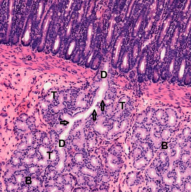 Compound branched tubular glands feature a branched duct system leading to multiple, tubular-shaped secretory units. One of the examples can be seen in Brunner’s glands (B) which are located underneath the duodenal villi (Fig. 2-58). It is shown that glandular acini (T) have their secretory ducts connected to the main duct (D).