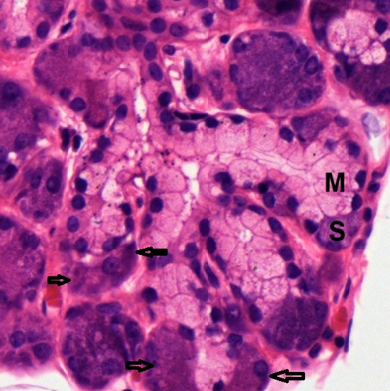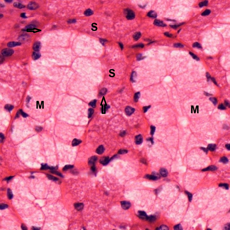 The submandibular gland (Fig. 2-60) is a mixed gland composed of mucous (M) and serous (S) secretory cells. It is found that tubular mucous cells are covered by acinar serous cells to form demilunes (arrow). The sublingual gland (Fig. 2-61) is also a mixed gland. Although it is composed of more mucous (M) and less serous (S) secretory cells compared to submandibular gland, it can be seen that tubular mucous cells are covered by acinar serous cells to form demilunes (arrow).