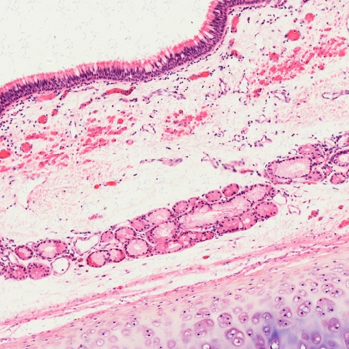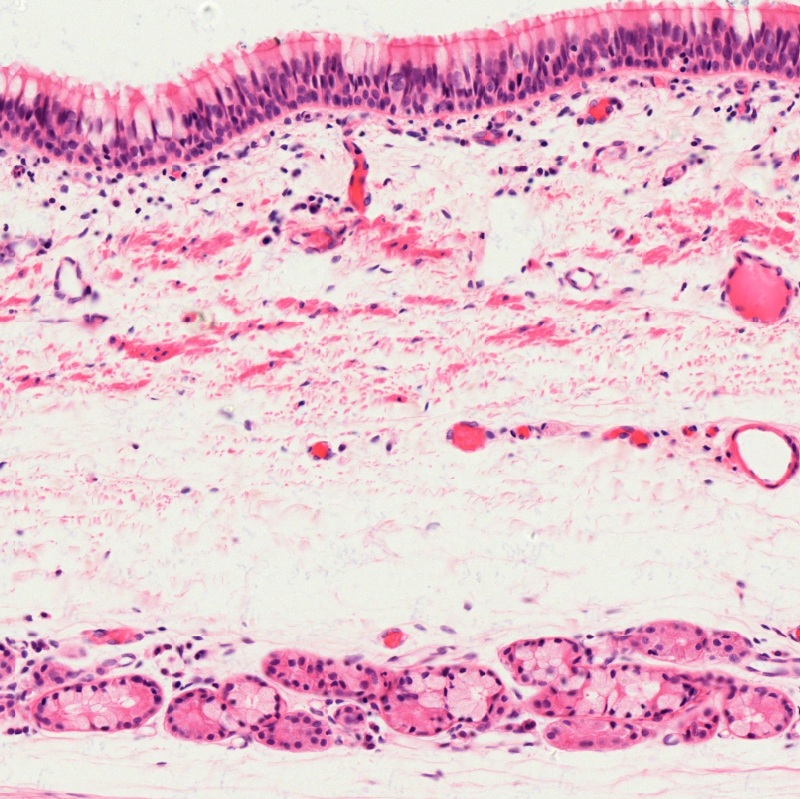 Mucous glands are mainly found in the submucosa of various organs, especially in the respiratory and digestive tracts, such as trachea (Fig. 2-62), small intestine (Fig. 2-63) and large intestine (Fig. 2-64). They secrete mucin, a glycoprotein forming mucus which serves to lubricate, protect, and trap foreign particles in the airways and digestive system.