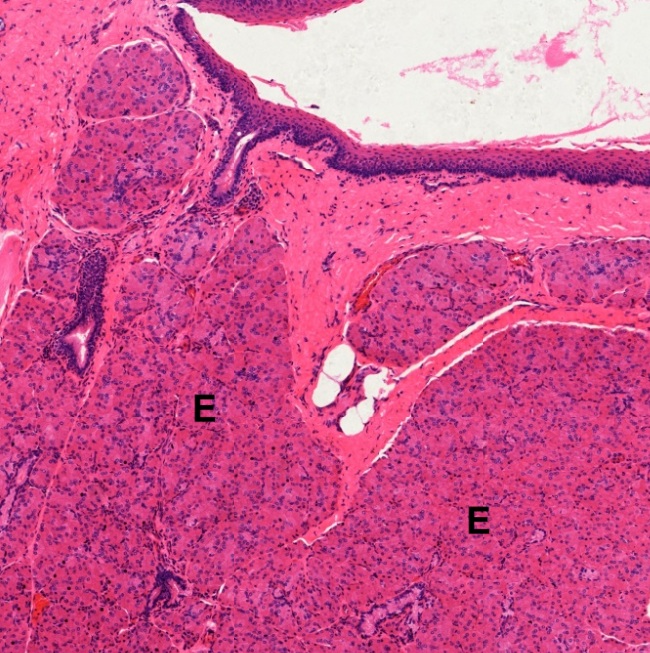 Serous glands secrete a watery, protein-rich fluid called serous fluid, often containing enzymes like alpha-amylase to aid in digestion. These glands are composed of serous cells, which have round nuclei and eosinophilic granules in their cytoplasm. Examples of serous glands include the parotid gland (Fig. 2-65), lacrimal glands (Fig. 2-66), and the Von Ebner’s glands (E) on the tongue (Fig. 2-67), as well as sweat glands (Fig. 2-68) and the exocrine pancreas (Fig. 2-69).