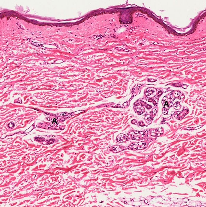Apocrine glands, also known as apocrine sweat glands. They are sweat glands (A) in axillary skin (Fig. 2-74), areola and nipple (Fig. 2-75) of the breast, ear canal, eyelid (Fig. 2-76), wings of the nostril, perineal region (Fig. 2-77), and some parts of the external genitalia. In the eyelid (Fig. 2-76) there are two exocrine glands associated with the eyelash (E). Glands of Zeis (Z) are sebaceous glands and glands of Moll (M) are apocrine sweat glands. In perineal skin (Fig. 2-77), apocrine sweat glands (A) are found to be connected to the hair follicles (H) together with sebaceous glands (S). The difference between merocrine sweat gland and apocrine sweat gland will be discussed in the chapter of Integument.