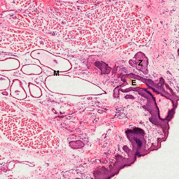 H090010 Lip, cs. human, HE, showing junction of keratinized and non-keratinized epithelia. (Figs. 2-29, 2-73)