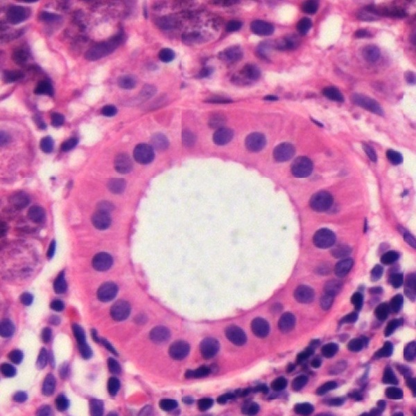 Examples of simple tubular glands can be found to be intestinal glands located in both small intestine (Fig. 2-50) and large intestine (Fig. 2-51), composed primarily of goblet cells and absorptive cells. The secretory products are discharged into a single, straight tubular lumen (arrow).