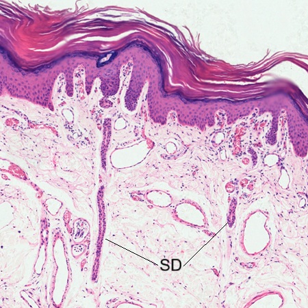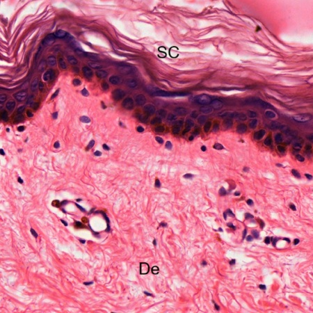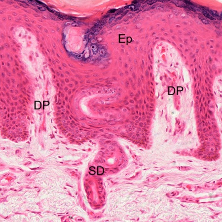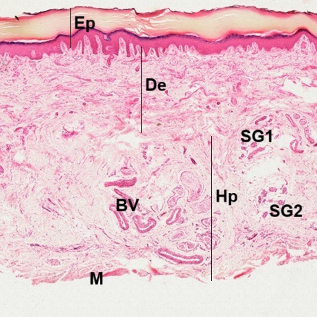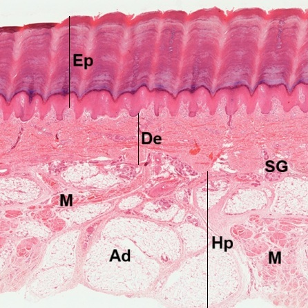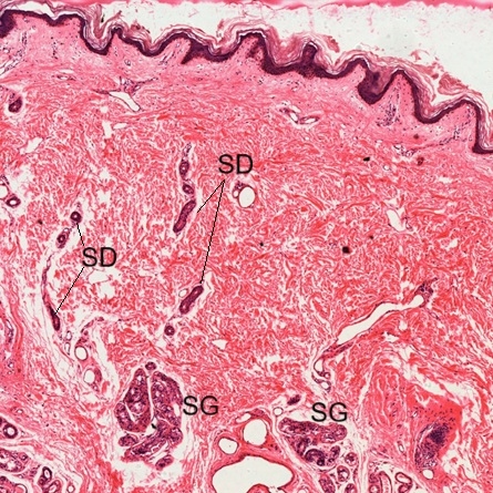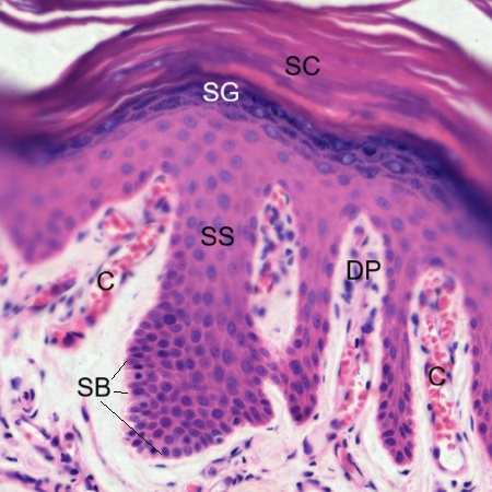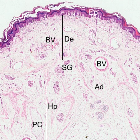 Thin skin is a type of skin found on most of the body, except for the palms and soles. A section of facial skin stained by HE (Fig. 10-16) reveals that the epidermis (Ep) is very thin relative to dermis (De) and hypodermis (Hp). There are sweat glands (SG) and blood vessels (BV) spreading within dermis and hypodermis. Pacinian corpuscles (PC) and adipose tissue (Ad) can be found in the hypodermis. The epidermis (Fig. 10-17) has four layers: the stratum basale (SB), stratum spinosum (SS), stratum granulosum (SG), and stratum corneum (SC). The refractive layer, stratum lucidum, is not seen. Many capillaries (C) are found in the dermal papillae (DP). Dermis is composed of dense irregular connective tissue (Fig. 10-18). Secretory ducts (SD) of sweat glands are seen to spiral upwards and pierce through the epidermis.