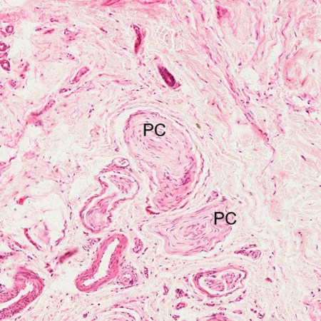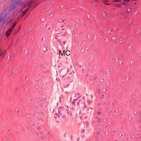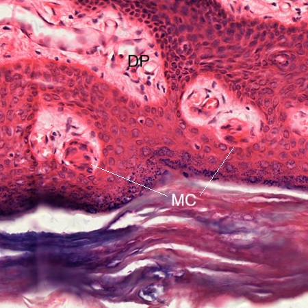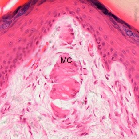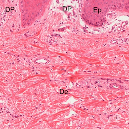 Dermis (De) is composed of dense irregular connective tissue. The border line between epidermis (Ep) and dermis is wavy to form dermal papillae (DP) into the epidermis (Fig. 10-8). Capillaries (C) are seen to enter into the dermal papillae (Fig. 10-9). In addition to the capillaries, Meissner’s corpuscles (MC) can be also found in the dermal papillae (Figs. 10-10 and 10-11). Detailed structure of the Meissner’s corpuscle has been illustrated in the chapter NERVOIUS TISSUE (Figs. 7-88, 7-89, 7-90).