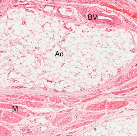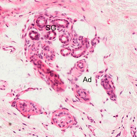 Hypodermis (Fig. 10-12) is composed of loose connective tissue with adipose tissue (AD). Blood vessels (BV) and muscle bundles (M) underneath the hypodermis are seen. As mentioned above, sweat glands (SG) can also be found to be with adipose tissue (Ad) in the hypodermis (Fig. 10-13). Sweat gland is a simple coiled tubular gland. Its secretary duct (SD) is found to spiral upwards (Fig. 10-14) and pierce through the epidermis (Ep) but not through the dermal papillae (DP). Two Pacinian corpuscles (PC) are also found in the hypodermis (Fig. 10-15). Detailed structure of the Pacinian corpuscle has been illustrated in the chapter NERVOIUS TISSUE (Figs. 7-91, 7-92, 7-93, 78-94).