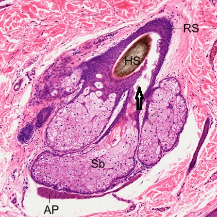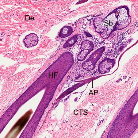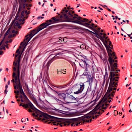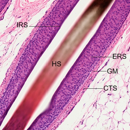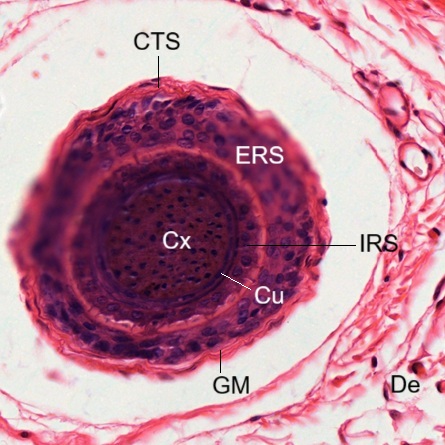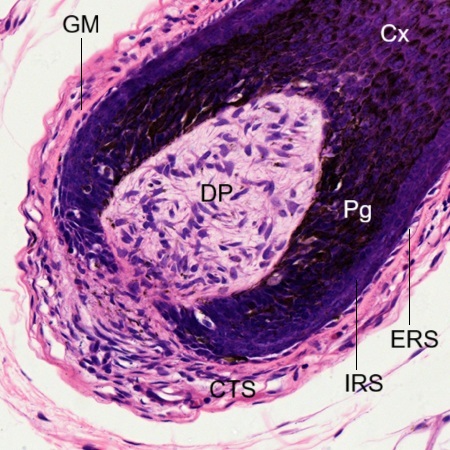 A longitudinal section of hair follicle reveals an enlarged hair bulb formed at its bottom end (Fig. 10-30). The hair bulb comprises the expanded portion of the inferior hair follicle and contains the dermal papilla (DP) and hair matrix. The dermal papilla consists of mesenchymal cells with blood vessels and nerve endings. The hair matrix consists of proliferating keratinocytes. These cells proliferate and gradually move upwards where they are keratinized to produce the hair shaft. Large amount of pigment (Pg), produced by melanocytes, are seen in the basal layer extending up into cortex (Cx). The melanocytes are derived from the stratum basale of epidermis. As seen in other part of the hair follicle, the entire hair bulb is surrounded by internal root sheath (IRS), external root sheath (ERS), glassy membrane (GM) and connective tissue sheath (CTS). Moving the observation field upward (Fig. 10-31), It reveals that the cortex (Cx) is the thickest layer of the hair shaft, made of densely packed, heavily keratinized cells that provide mechanical strength and color to the hair due to the presence of melanin pigment. Other layers of the hair follicle can be seen clearly, including cuticle (Cu), internal root sheath (IRS), external root sheath (ERS), glassy membrane (GM) and connective tissue sheath (CTS). Moving further upward, a nature space appears between hair shaft (HS) and root sheath. Layers of root sheath remain intact, including internal root sheath (IRS), external root sheath (ERS), glassy membrane (GM) and connective tissue sheath (CTS). At this point, the hair follicle is still in the hypodermis.