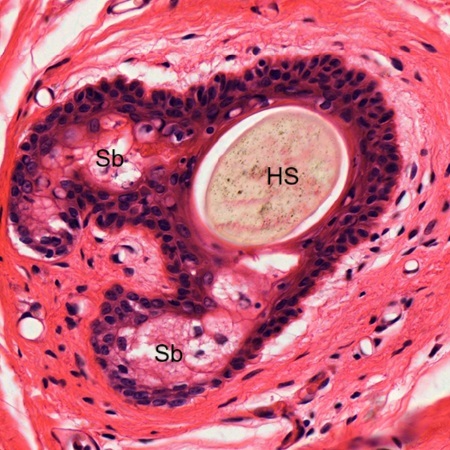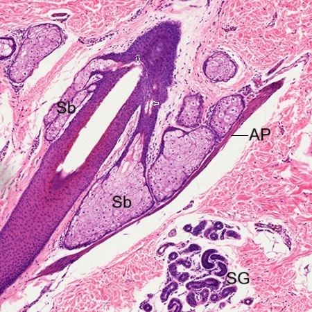 Once the hair follicle (HF) enters the dermis (De), sebaceous gland (Sb) and arrector pili (AP) appear to attach to it (Fig. 10-33). Arrector pili, also known as hair erector, is a group of smooth muscle fibers that are connected to the connective tissue sheath (CTS) of the hair follicle and extend towards the epidermis. These muscles are innervated by autonomic nerve fibers and are responsible for moving the hair, causing it to stand on end. Sebaceous glands (Sb) and arrector pili (AP) seem to have a locational relationship (Fig. 10-34). Sebaceous glands produce an oily substance called sebum. This sebum lubricates the skin and hair, protects against moisture and bacteria, and helps remove old skin cells. In this micrograph, their secretory ducts are seen to open into the nature space between hair shaft and root sheath. Sweat glands (SG) are also found around. In the other micrograph (Fig. 10-35), sebaceous gland (Sb) and arrector pili (AP) are shown. Secretory duct of the sebaceous gland is channeled to the nature space between hair shaft (HS) and root sheath (RS). The sebaceous glands are simple branched acinar glands. They release contents with the entire cells themselves, becoming part of the secretion in a way like other holocrine glands. The sweat glands (Fig. 10-36) of the scalp or other parts of the skin mentioned above are simple coiled tubular glands. They excrete products through exocytosis into the epithelial-walled ducts and then to lumen without causing any damage or loss in the secretory cell. Thus, they are merocrine glands, also known as eccrine glands.