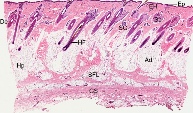 The scalp is the area of the upper face covered by hair, consisting of five parallel layers: skin, superficial fatty layer, galea aponeurotica, loose areolar tissue, and periosteum. In a section of scalp (Fig. 10-28), three layers of skin structure, including epidermis (Ep), dermis (De), and hypodermis (Hp) are seen. The adipose tissue contained (Ad) in the hypodermis is continuous with superficial fatty layer (SFL) and galea aponeurotica (GA). Many hair follicles (HF) emerged hairs (EH), sebaceous glands (Sb), and sweat glands (SG) are seen. The scalp skin consists of the same five epidermal layers as seen in the thick skin (Fig. 10-29): stratum corneum (SC), stratum lucidum (SL), stratum granulosum (SG), stratum spinosum (SS), stratum basale (SB). Melanin granules produced by melanocytes are seen to be accumulated in the stratum basale. Dermis (De) is composed of dense irregular connective tissue.