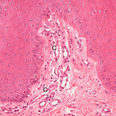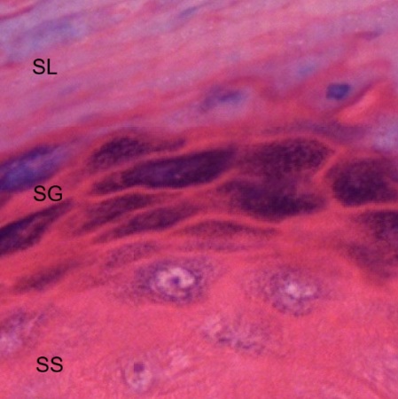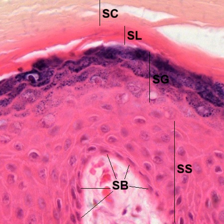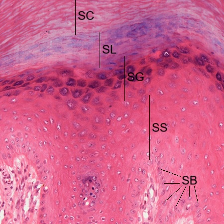 3) Stratum Granulosum (SG) – layers of keratinocytes with numerous basophilic, keratohyalin granules in their cytoplasm (Fig. 10-5).