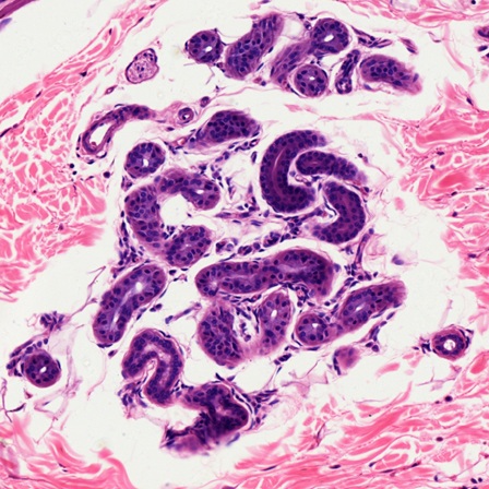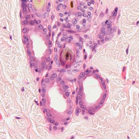 H080030 Scalp, sec., human, HE, showing hair follicles, sebaceous and sweat glands. (Figs. 10-28, 10-29, 10-30, 10-31, 10-32, 10-33, 10-34, 10-35, 10-36)