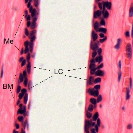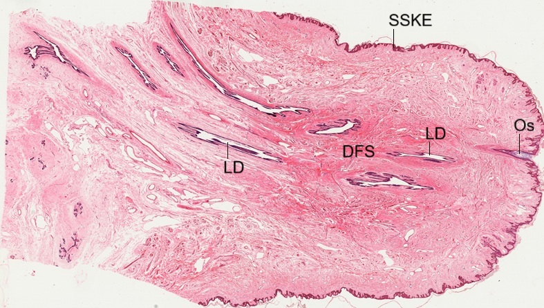 Nipple and surrounding areolar skin are specialized part of the skin. In section of nipple stained by HE (Fig. 10-41) reveals that it is covered with a stratified squamous keratinized epithelium (SSKE) and contain lactiferous ducts (LD) within dense fibrous stroma (DFS). Ostium (Os) of the lactiferous duct is seen on the skin surface. The epidermis contains a lot of clear keratinocytes or Toker cells (TC), which are believed to develop from sebaceous glands (Fig. 10-42). Sebaceous glands (Sb) are seen but hair follicles are absent. They may have their own excretory ducts (arrow) or share ostium with a lactiferous duct. The lactiferous duct (Fig. 10-43) is composed of a double-layered epithelium with luminal cells (LC) on the inside and myoepithelial cells (Me) on the outside, beneath a basement membrane (BM).