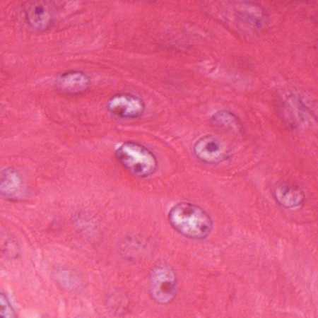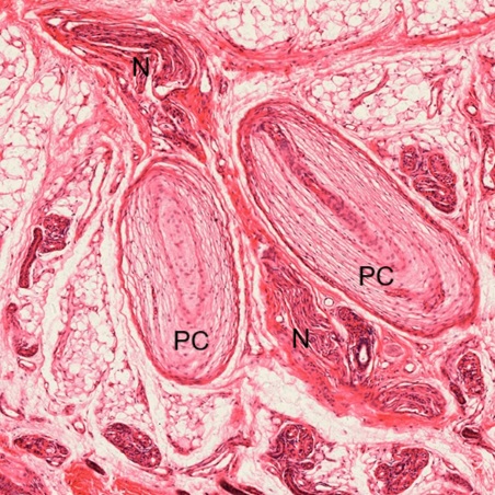 Nail is a highly specialized appendage formed on the dorsal skin surface of the tip of each finger and toe. A longitudinal section of infant finger stained by HE (Fig. 10-44) reveals that the nail is a highly keratinized structure located on the dorsal surface of the distal phalanx (DP), which has the hyaline cartilage (HC) covering proximal end articulated with the middle phalanx (MP). The horny nail plate (NP) extends deep into the dermis (De), forming the nail root (NR). The epidermis of the dorsal skin forms a continuous fold resulting in the eponychium (Ep), or cuticle, the nail bed (NB) underlying the nail plate, and the hyponychium (Hy). The epithelium (arrow) surrounding the nail root is responsible for the continuous elongation of the nail. In ventral skin (VS) of the finger, a lot of sweat glands (SG) are seen between dermis and hypodermis. In the hypodermis, many Pacinian corpuscles (PC), blood vessels (BV), and nerve bundles (N) are found to be surrounded by the adipose tissue (Ad). In the epidermis of ventral skin (Fig. 10-45), Meissner’s corpuscles (MC) are found to be located in the dermal papillae (DP). Two Pacinian corpuscles (PC) with nerve bundles (N) in between show typical onion-like structure (Fig. 10-46).