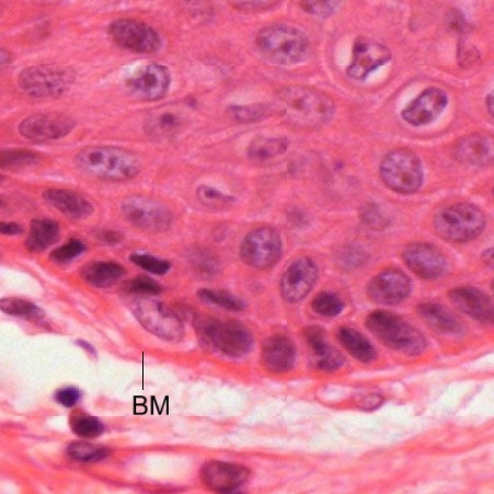 5) Stratum Basale (SB) – a single layer of germinal cells resting on the basement membrane (BM) which is attached to the dermis (Fig. 10-7).