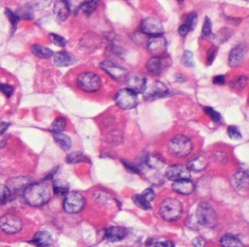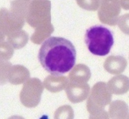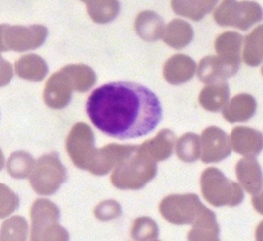 GS = Giemsa stain, is commonly used to stain blood cells and cellular elements in other smear preparation such as bone marrow. Nuclei are stained dark blue to violet, background cytoplasm pale blue and erythrocytes pale pink.