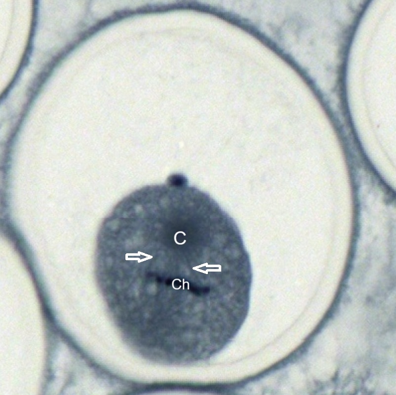 The centrosome is composed of two centrioles perpendicular to each other. It is in the cell adjacent to the cell nucleus and plays as a microtubule organizing center (MTOC). It cannot be observed at light microscopic level but appears to be visible during cell division when two centrioles (arrows) move toward opposite poles of the dividing cell (Figs. 1-29 and 1-30). The centrosome is also involved in the formation of cilia and flagella. At the cilial base of trachea epithelial cells (Fig. 1-31) and epithelial cells of oviduct (Fig. 1-32) densely stained connected lines (arrow) can be seen under the light microscope. These lines are made up of basal bodies of cilia and junctional complex between epithelial cells. Both cilia and basal bodies contain microtubules and have similar structures to centrioles.