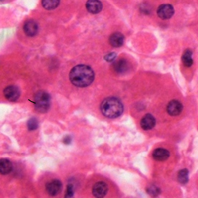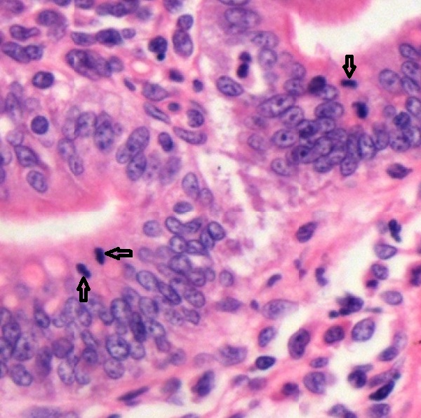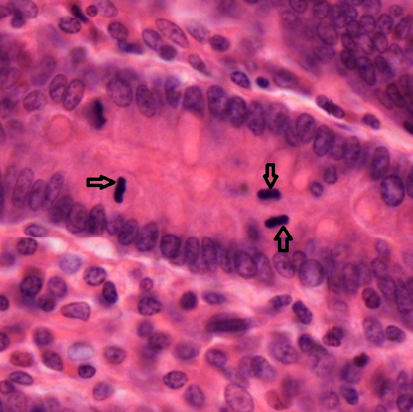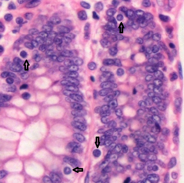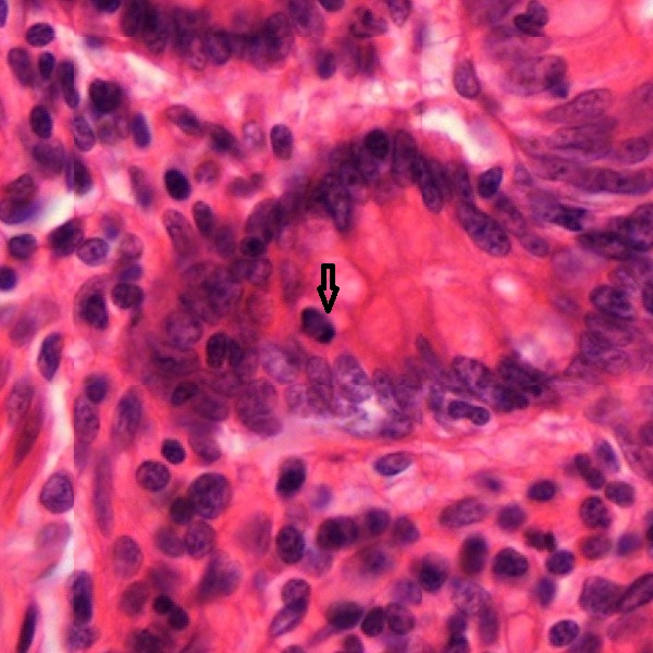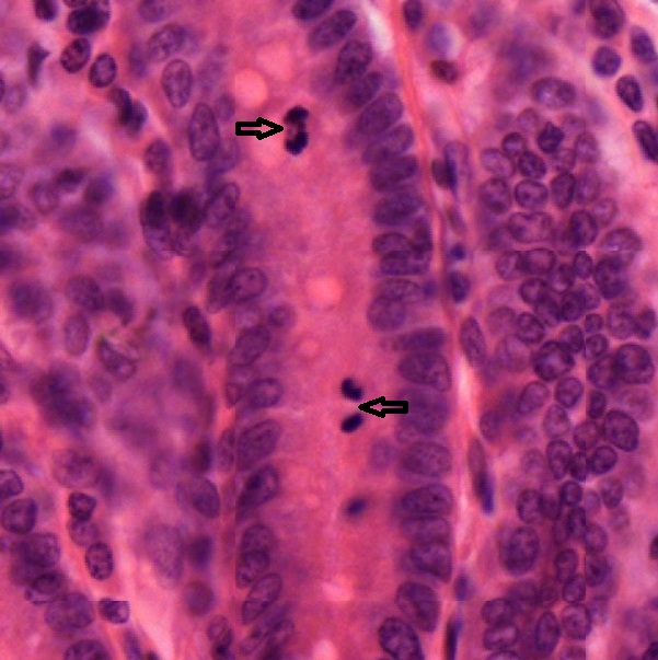 Cell division or mitosis can be observed in many cell types under the light microscope. Among the short-lived cells, intestinal epithelial cells are chosen here. In sections of human intestines with routine hematoxylin-eosin staining, some epithelial cells are found to undergo cell division (Figs. 1-49 ~ 1-52) ). Epithelial cells undergo mitosis reveal broken nuclei with obvious aggregates of chromosome strands (arrow).