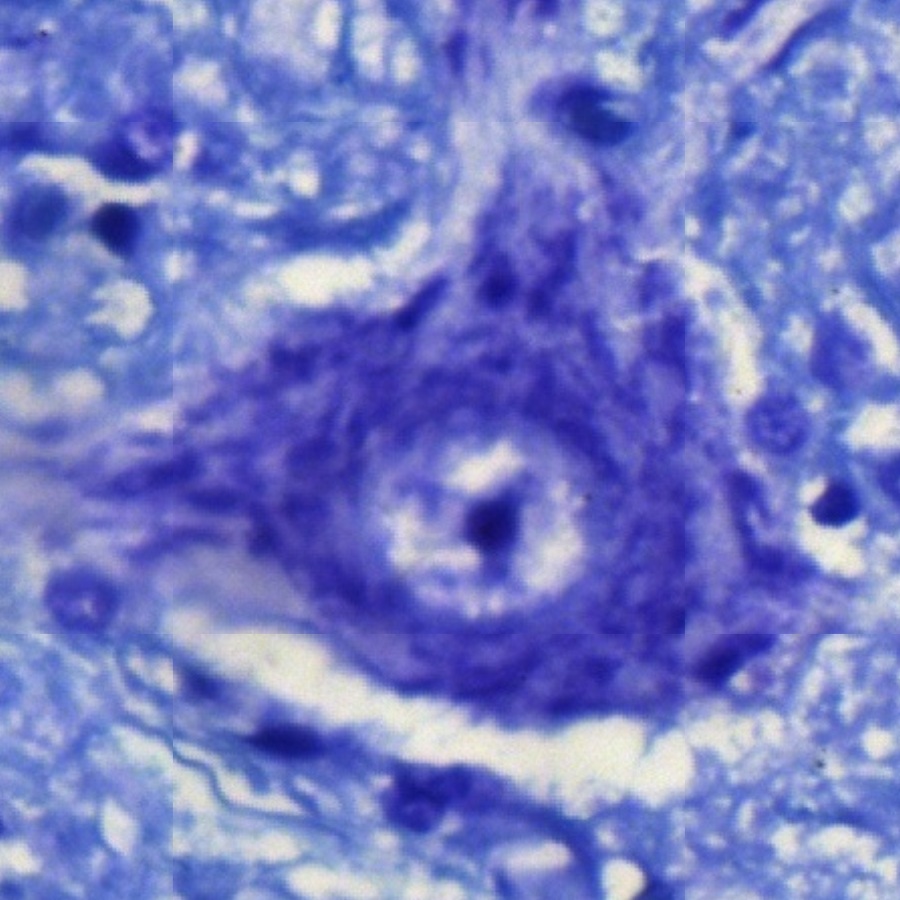 CV = cresyl violet, as methylene blue, is used to stain rough endoplasmic reticulum to show clumps of Nissl substance, or Nissl bodies which are dark blue in contrast to pale blue of background cytoplasm.
