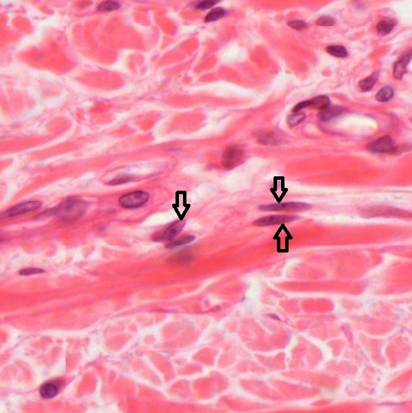 It acts as the control center of the cell and contains nucleolus and long strands of chromosomes. Like cell membrane, the nuclear membrane is also a double membrane. It encloses the nucleus and separates its contents from the cytoplasm. While the nuclear membrane is invisible under the light microscope, nucleolus and chromosomes are distinguishable. Both make up the nucleoplasm. The sizes and shapes of cell nuclei (pleural form of nucleus) are found to be variable: oval nuclei (arrow) in skeletal muscle fibers (Fig. 1-41), columnar nuclei toward the free surface in intestinal epithelial cells (Fig. 1-42), spherical nucelli in liver cells (Fig. 1-43), and fusiform nuclei (arrow) in fibroblasts (Fig. 1-44). Despite the morphological variation, all nuclei have a central nucleolus with strands of chromosomes enclosed by the nuclear membrane.