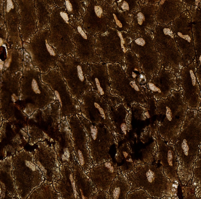 In a whole mount preparation of frog mesentery with silver impregnation, a layer of mesothelium composed of simple squamous epithelium can be observed under the light microscope (Figs. 1-5 and 1-6). At higher magnification with a 40X objective lens (Figs.1-7 and 1-8), in each coarse mesh flat and polygonal fine meshes with unsmooth borders (arrow) can be observed. These unsmooth borders represent the existence of cell membranes even they are invisible at the light microscopic level. The squamous epithelial cells are seen to be packed closely with almost no intercellular space but stained cellular outline. Inside the squamous epithelial cells cell nuclei (N) can be seen as unstained oval spots.