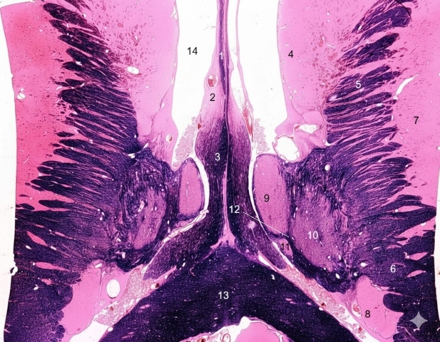 8. Tail of caudate nucleus 9. Anterior nucleus of thalamus 10. Lateral posterior nucleus of thalamus 11. Lateral dorsal nucleus of thalamus 12. Internal medullary lamina 13. Splenium of corpus callosum 14. Lateral ventricle