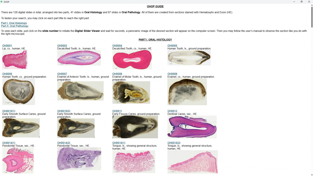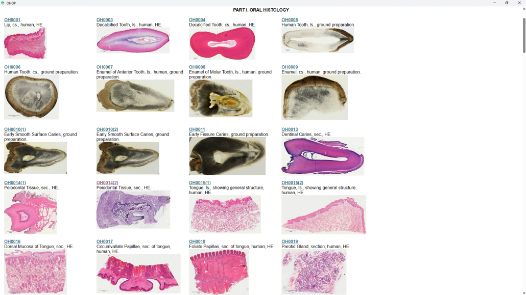 The view will be returned to the “Part I. Oral Histology” of “OHOP Guide”. Color change of “OH0014” indicates that this slide has just been observed.