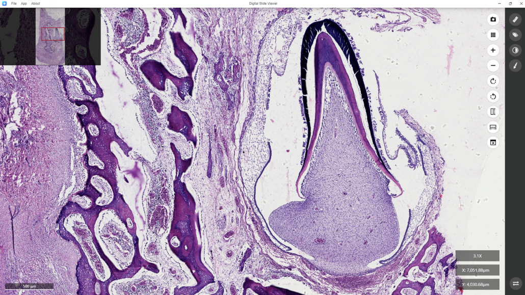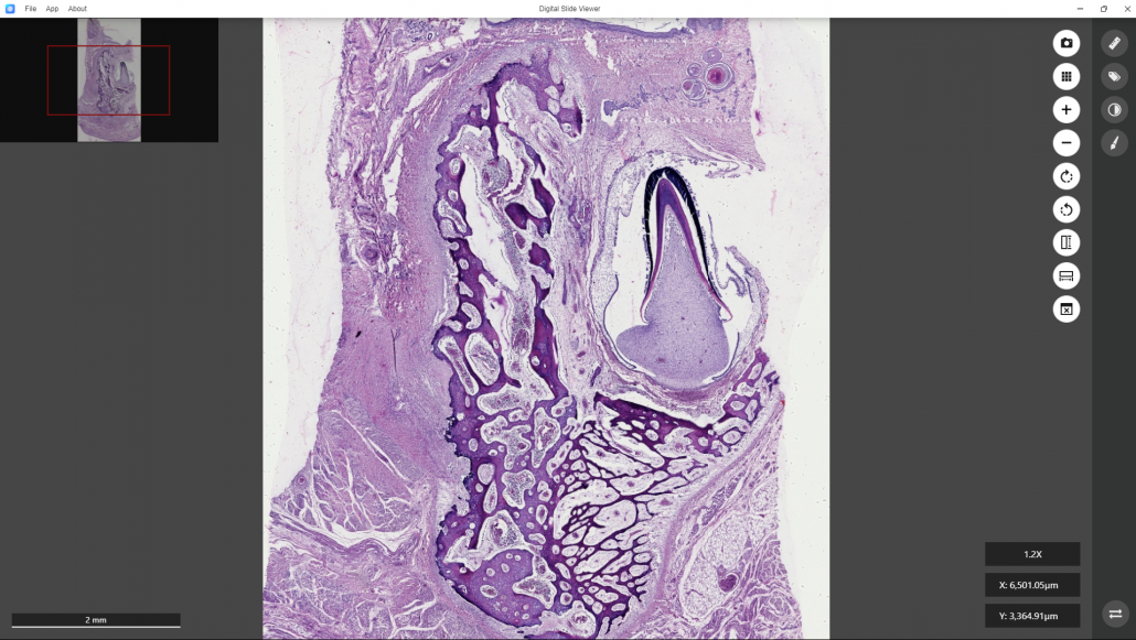 By clicking the “Rotate Toward Left” or “Rotate Toward Right” command at the right bar of the software, the image can be rotated to showthe tooth eruption toward the top. A small window at the top left corner shows the location of the enlarged image in the entire section.